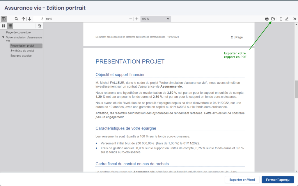 Depuis le simulateur Assurance vie, en cliquant sur le bouton Imprimer, vous avez désormais accès au rapport d’édition actuellement disponible dans Big.
