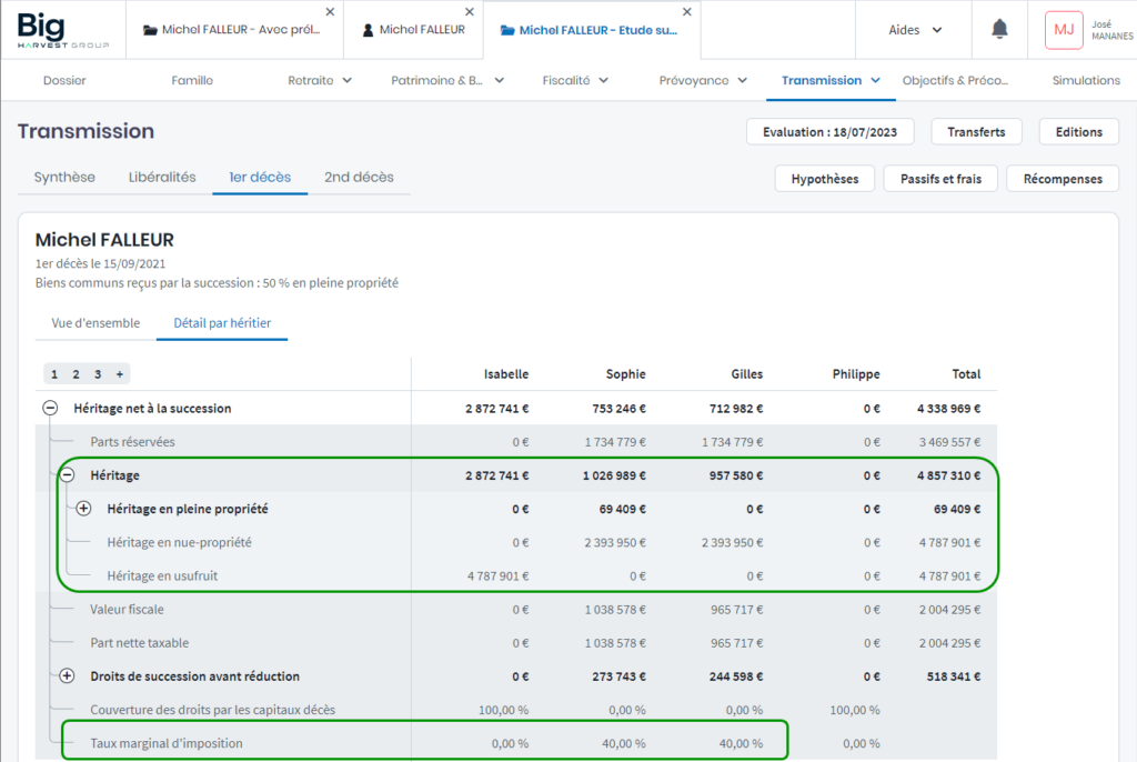 - Pour chaque héritier ou bénéficiaire, les résultats relatifs à l’héritage, aux donations ou encore à la transmission de capitaux décès, offrent une vision globale de la transmission patrimoniale
