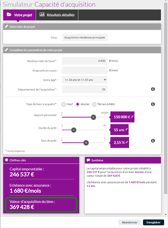 Avec le simulateur Capacité d’acquisition, Big vous aide à calculer rapidement le montant que votre client souhaite consacrer à un projet immobilier. L’estimation tient compte du type de bien à acquérir (neuf, ancien, terrain à bâtir), de l’apport personnel, du niveau d’endettement et des frais de notaire pour présenter un plan de financement du projet le plus complet possible.