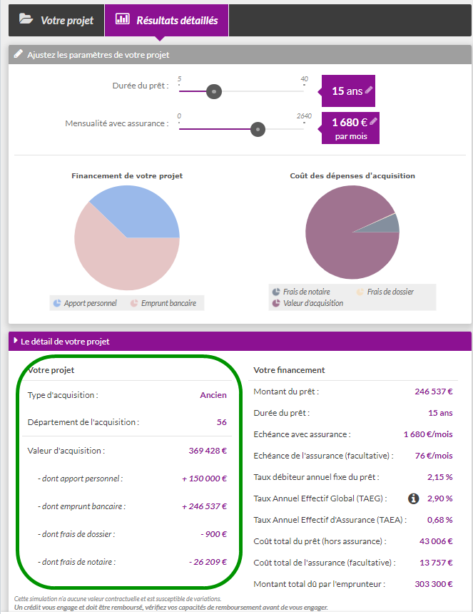 Dans la partie basse, retrouvez les chiffres clés et notamment la valeur d’acquisition potentielle du bien