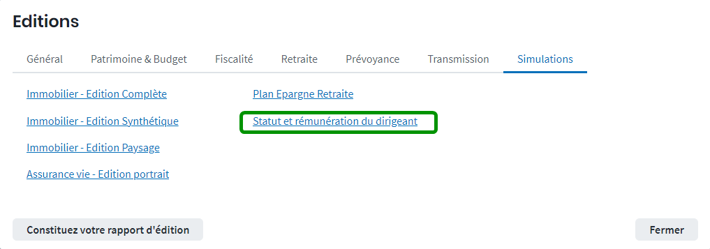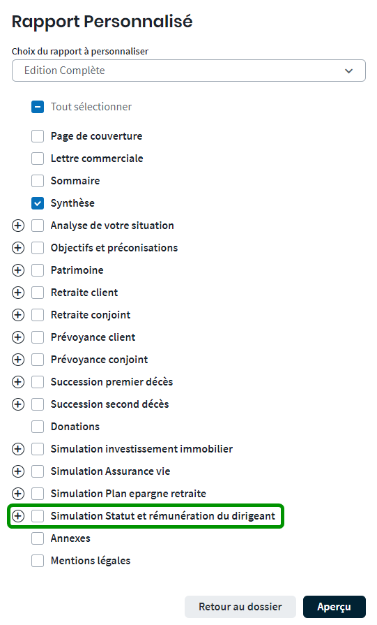 L’édition du simulateur « Statut et Rémunération du Dirigeant » est aussi intégrée à l’édition complète pour remettre à vos clients un rapport composé d’éléments de la situation globale de votre client en plus du contenu propre au simulateur.