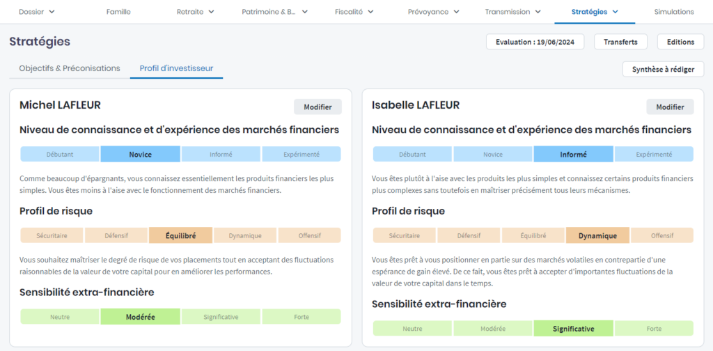 - le Profil d’investisseur : indiquer les niveaux de sensibilité du client (connaissance / expérience, risque et extra-financier)
