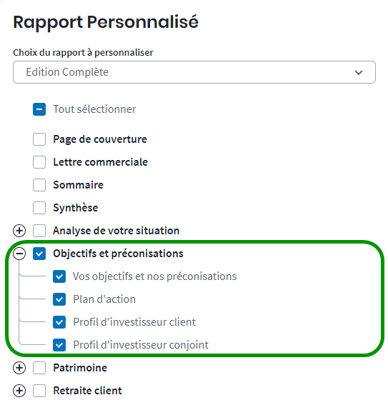 - les Objectifs & Préconisations : bâtir et structurer vos préconisations à partir des objectifs du client