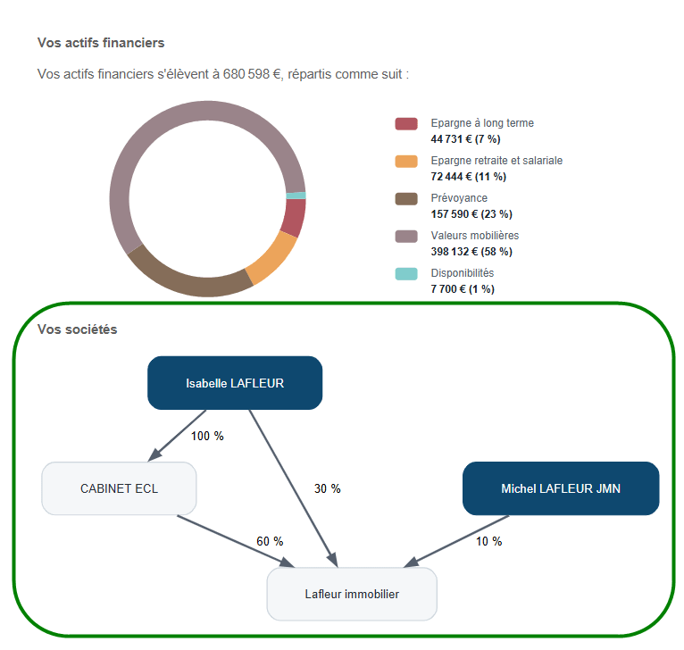En plus de leur affichage au survol de certains graphiques, les pourcentages sont désormais intégrés aux légendes, comme dans le bloc « Actifs » de la synthèse du patrimoine, ainsi que dans le graphique « Transmission nette » de la succession.