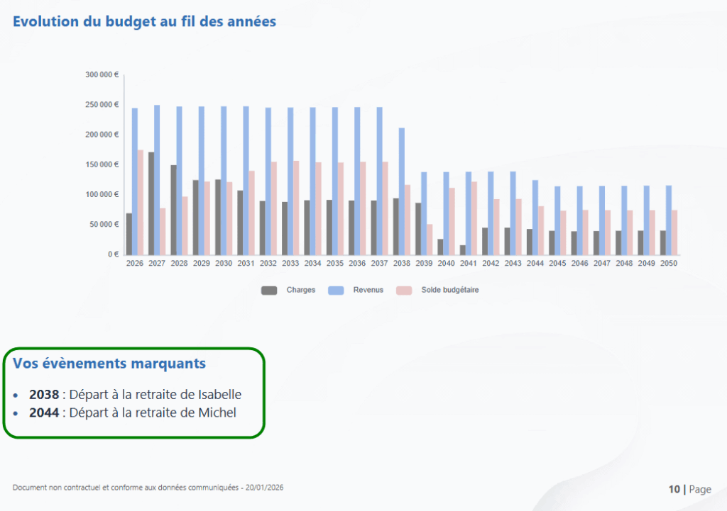 - Dans la page « Evolution du budget au fil des années », le départ en retraite étant un moment fort dans l’évolution du budget, les dates de départ en retraite du client et du conjoint ont été ajoutées :