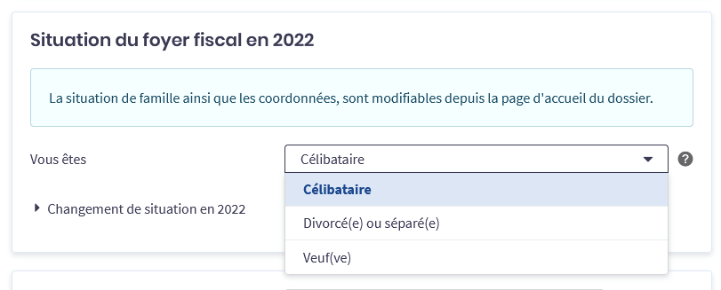 Dans le cas d’un couple en union libre, dans le dossier, la situation familiale est Union libre. Par contre, la situation du foyer dans la déclaration 2042 peut être célibataire, divorcée (ou séparée), ou veuve. La sélection d’une de ces situations est désormais possible dans la déclaration de revenus. Cette modification n’interrompt pas les transferts entre le dossier et les déclarations.