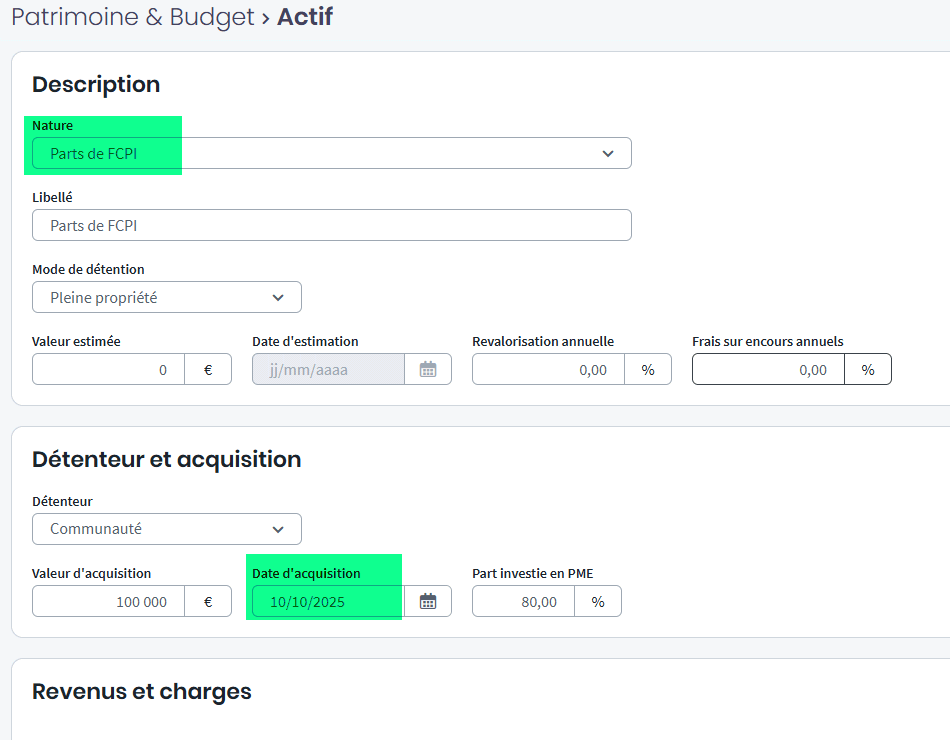 Le taux de 25 % est appliqué en saisissant un actif de nature Parts de FCPI avec une date de souscription comprise entre le 28 septembre et le 31 décembre 2025.