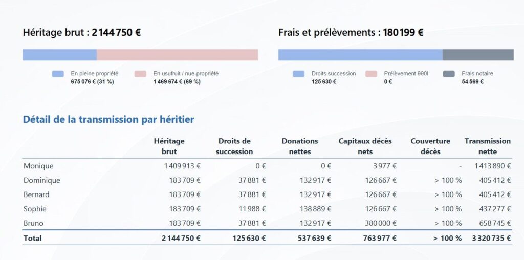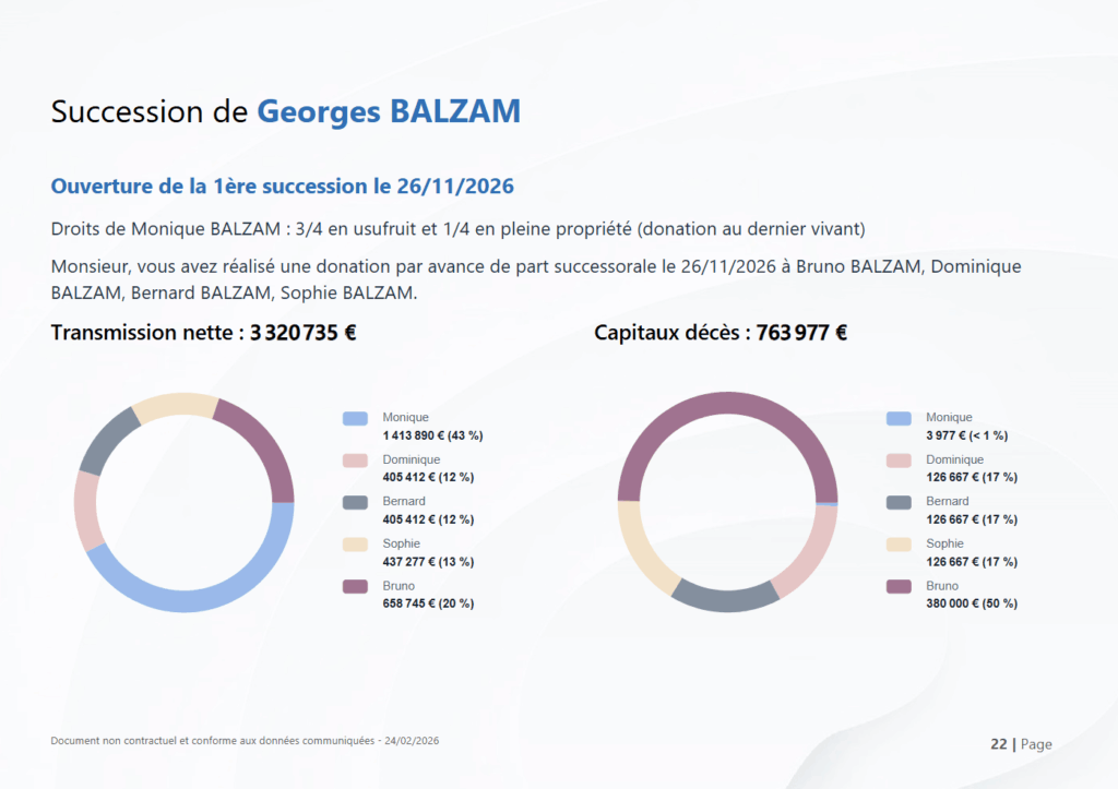 Sur la deuxième page, le graphique « Héritage brut » montre l’héritage reçu en pleine propriété, afin d’attirer l’attention de vos clients sur la partie dont les héritiers pourront disposer librement, ou en usufruit, nue-propriété.