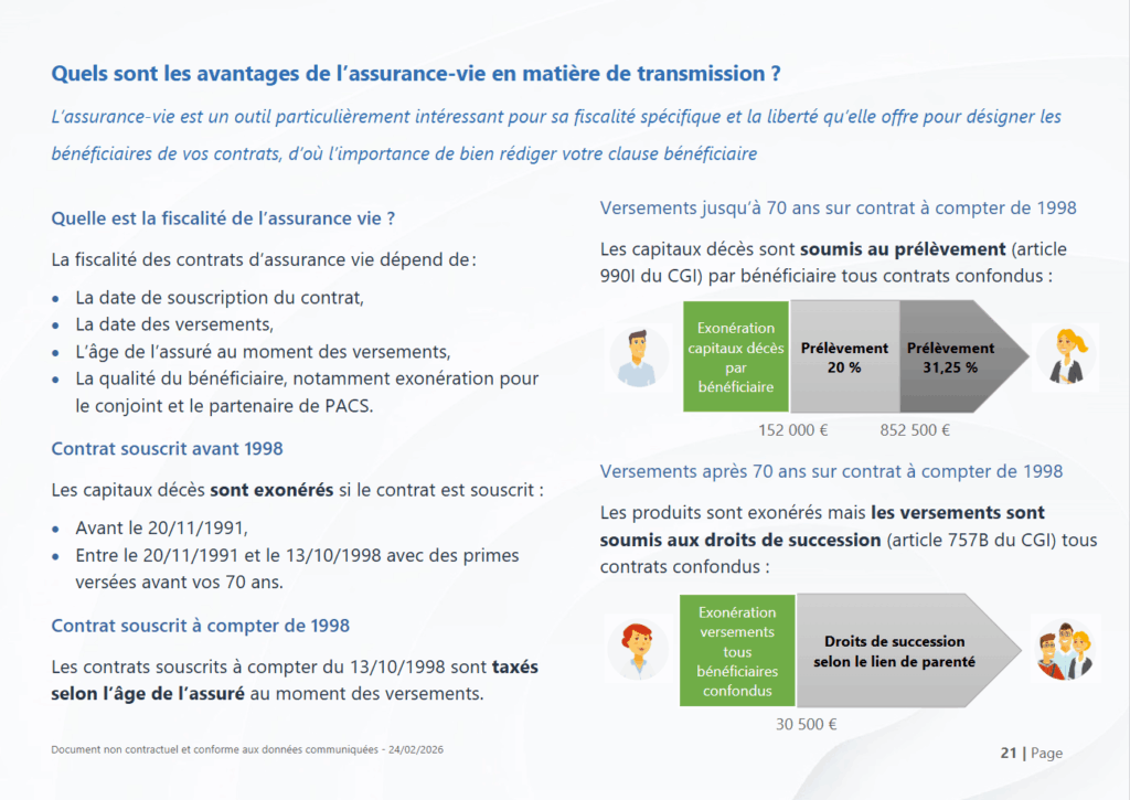 Dans la page détaillant les avantages de l’assurance-vie en matière de transmission, les règles fiscales ont été complétées en ajoutant un paragraphe sur les contrats souscrits avant 1998.