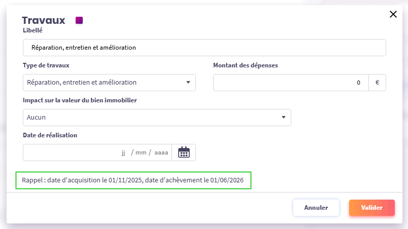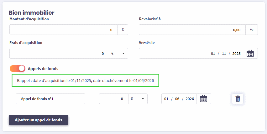 Pour vous éviter de renseigner des travaux ou des appels de fonds en dehors des dates de simulation, les dates d’investissement et d’achèvement sont rappelées dans les écrans de saisie des travaux et des appels de fonds.