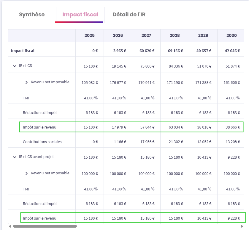 Enfin, un nouveau résultat a été ajouté dans le tableau Impact fiscal de l’onglet Résultats. Il s’agit de l’Impôt sur le revenu avant et après projet.