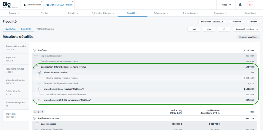 Vous retrouvez le détail du calcul dans l’onglet « Résultats« , rubrique « Impôt total ».