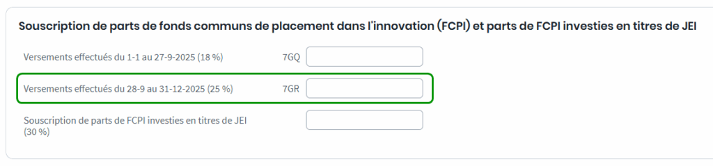 La hausse du taux de réduction d’impôt dite « Madelin » de 18% à 25% pour les versements effectués à compter du 28-9-2025 jusqu’au 31-12-2025, la partie FCPI a donc été modifiée afin d’avoir une distinction entre les versements effectués du 1-1 au 27-9-2025 (taux de 18%) et ceux effectués à compter du 28-9-2025 (taux de 30%). Un ajustement a également été réalisé dans cette partie puisque désormais, la réduction d’impôt s’ouvre également pour les FCPI investis dans des jeunes entreprises innovantes (JEI).