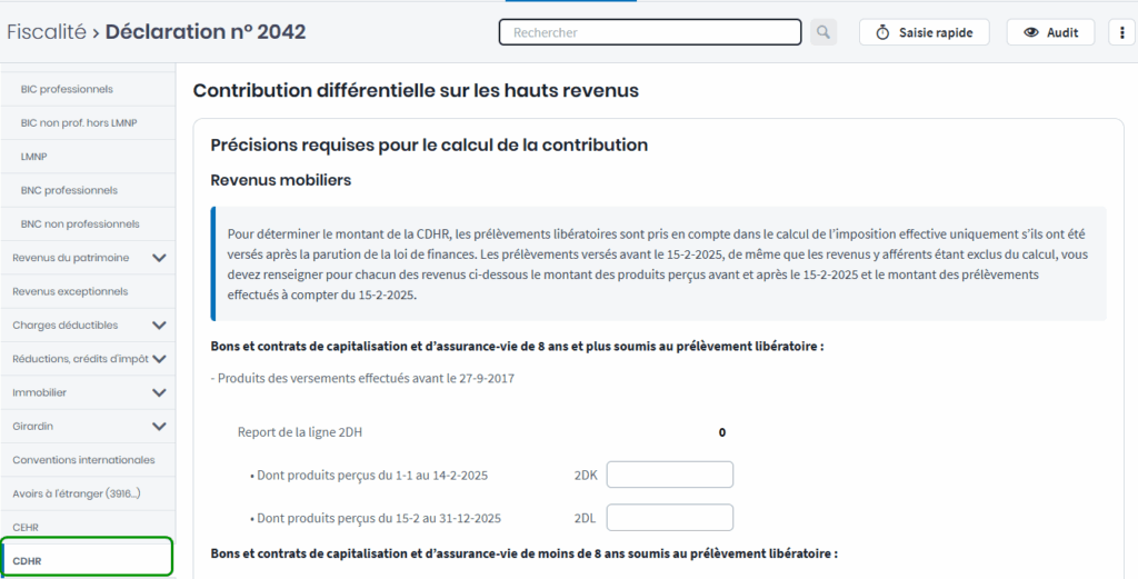 Vous pouvez désormais calculer le montant de la CDHR en saisissant vos revenus perçus du 1-1-2025 au 31-12-2025 et en complétant les éléments propres au calcul, tels que les retraitements, dans la nouvelle page de la déclaration n°2042 dédiée à cette contribution.