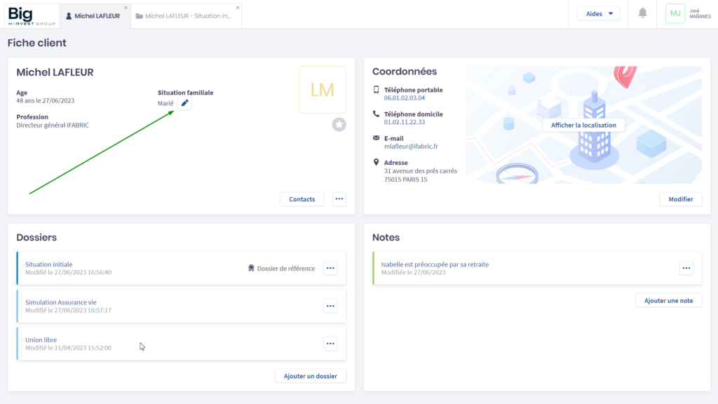 Vous ne le saviez peut être pas mais depuis la fiche client, vous pouvez modifier la situation familiale du dossier de référence. Cet accès est mis en évidence.
