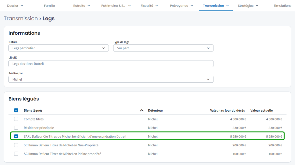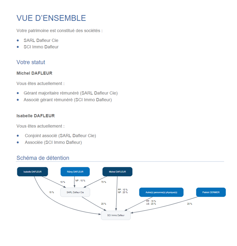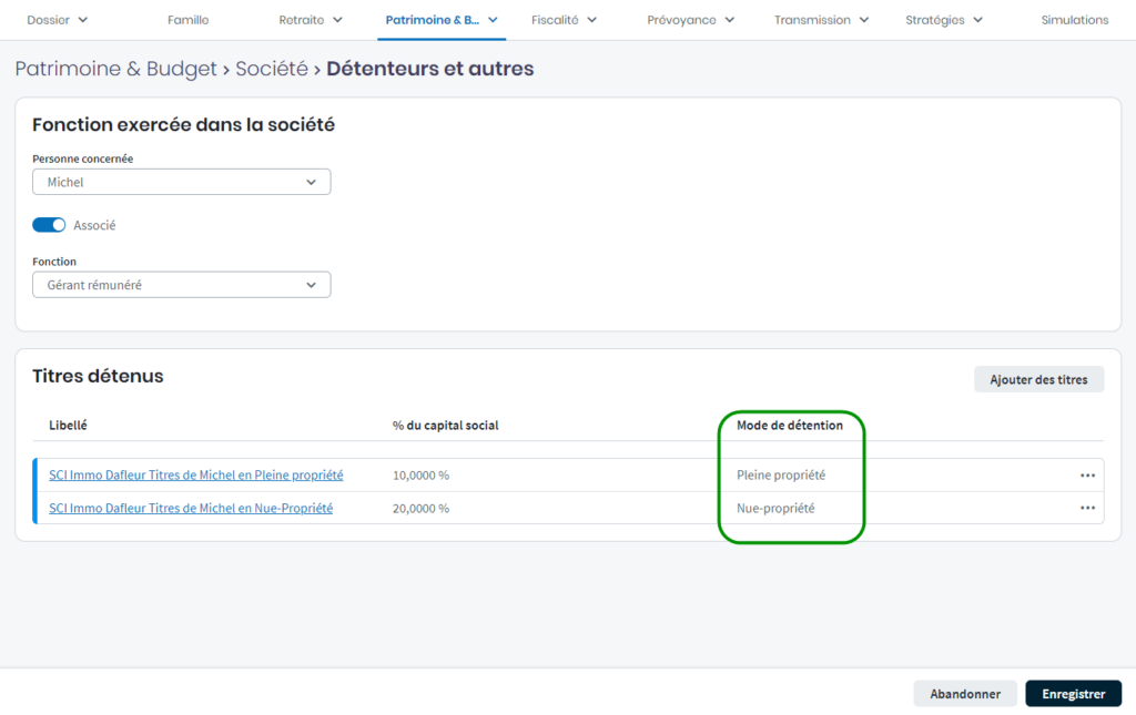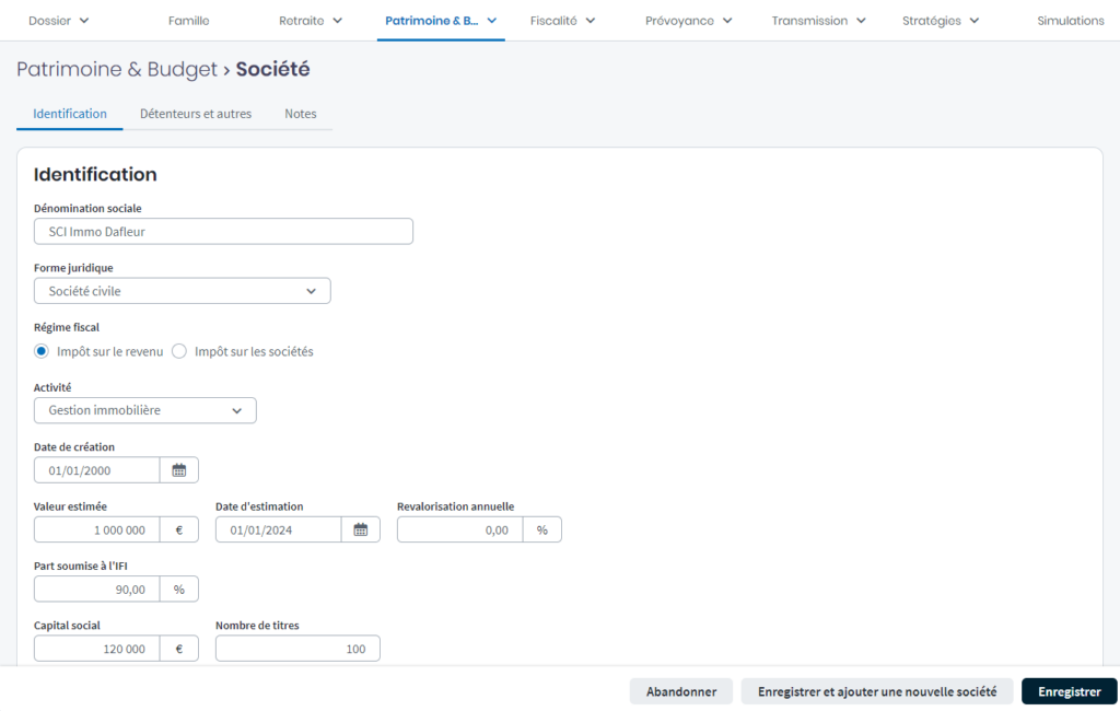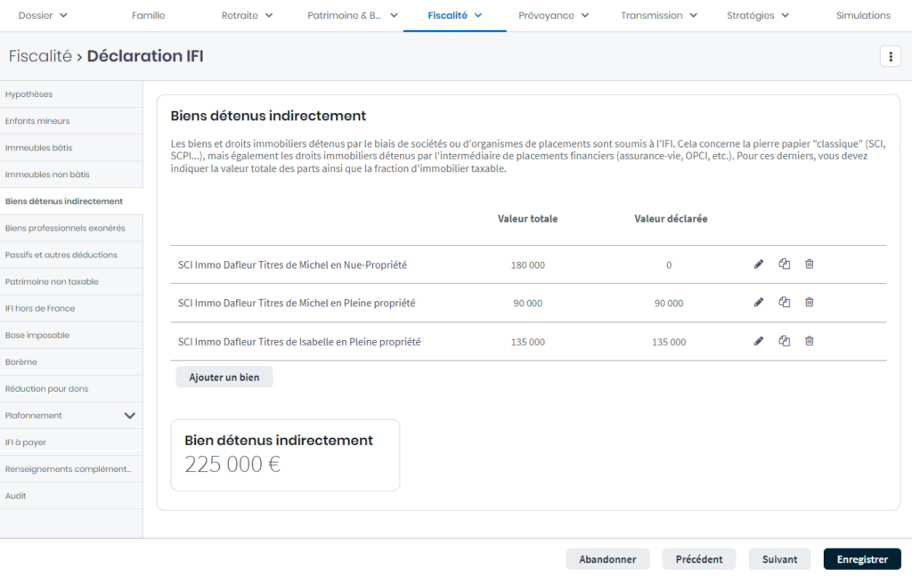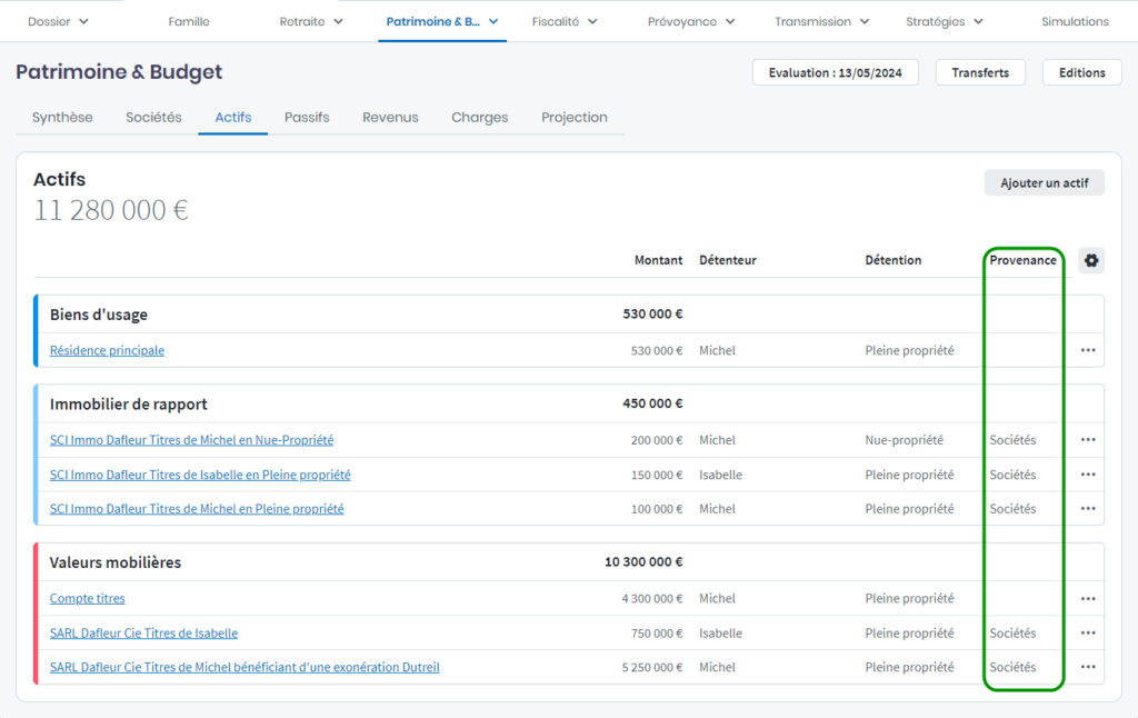 Dès la validation des saisies de la société, des actifs correspondant aux titres détenus par le client et son conjoint sont automatiquement créés dans le patrimoine et pris en compte dans l’IFI, la transmission.