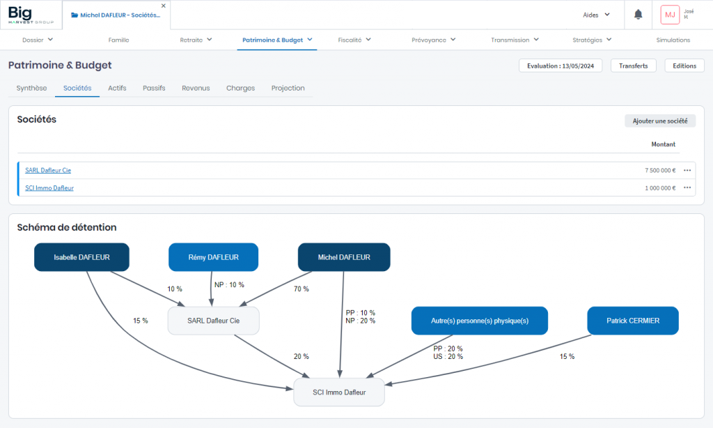 Afin de mieux appréhender l’articulation entre patrimoine professionnel et patrimoine privé, Big vous accompagne dans la collecte d’informations sur les sociétés de vos clients et propage ces informations dans les autres modules : Patrimoine, Projection, Fiscalité, Transmission. Bien entendu, toutes ces informations sont regroupées dans un rapport d’édition dédié aux sociétés à remettre à vos clients.