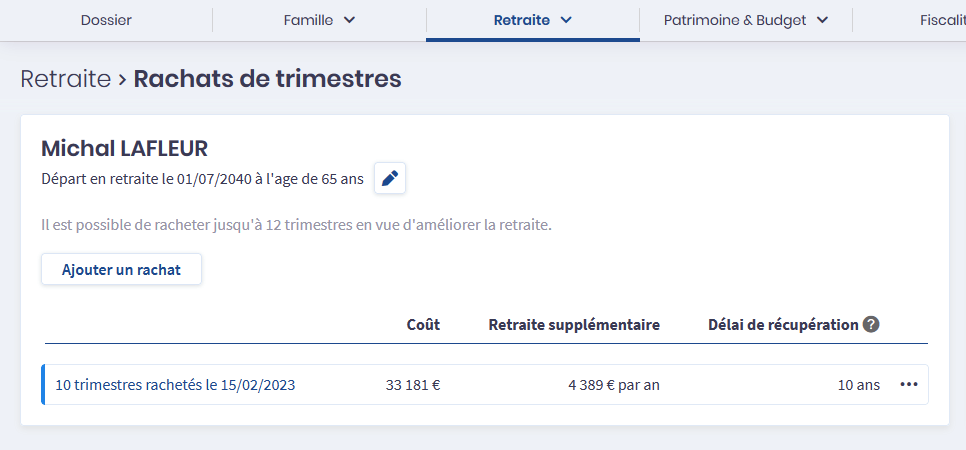 Depuis l’onglet « Retraite », le bouton « Rachats de trimestres » vous donne accès à la liste des rachats, cliquez ensuite sur « Ajouter un rachat » pour le renseigner.