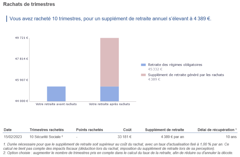 Vous retrouvez un récapitulatif des rachats saisis dans la page « Reconstitution de carrière », section « Rachats de trimestres« . Elle vous indique pour chaque rachat et pour l’ensemble des trimestres rachetés : le coût, le supplément de retraite généré et le délai de récupération. Un graphique illustre également l’augmentation de la retraite versée par les régimes de base à l’issue des rachats.