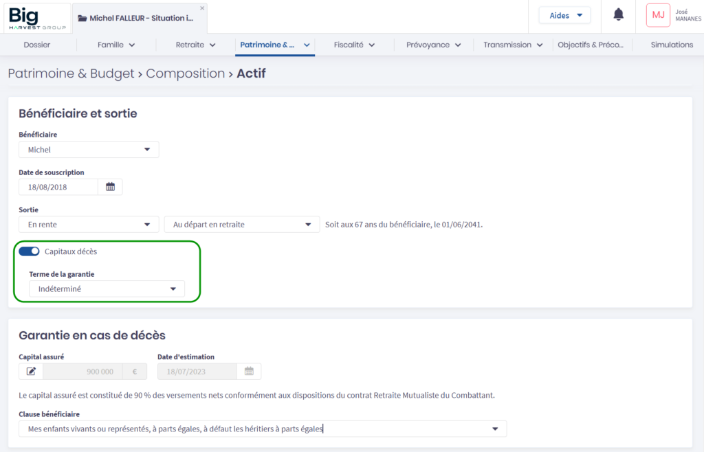 Pour renseigner cette garantie décès, dans l’actif, activez le switch « Capitaux décès ».