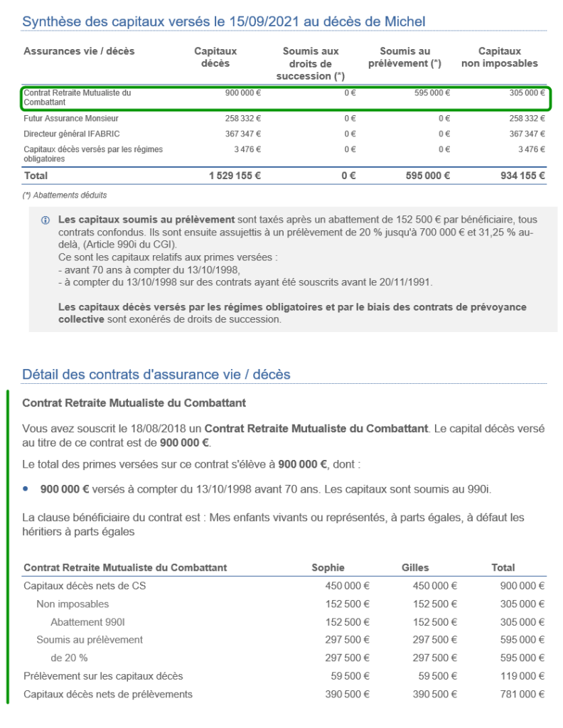 Dans la partie Prévoyance et Transmission, les capitaux décès sont présentés par bénéficiaire en y appliquant la fiscalité de l’assurance vie (990I ou 757B pour les versements après 70 ans).