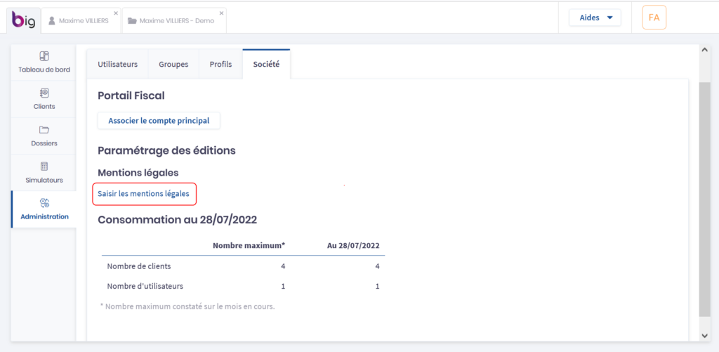 Il est maintenant possible d’ajouter des mentions légales afin que celles ci soient reportées dans les rapports d’éditions. Depuis l’onglet « Société » du module d’administration, cliquez sur Saisir les mentions légales pour accéder à cet écran de saisie.