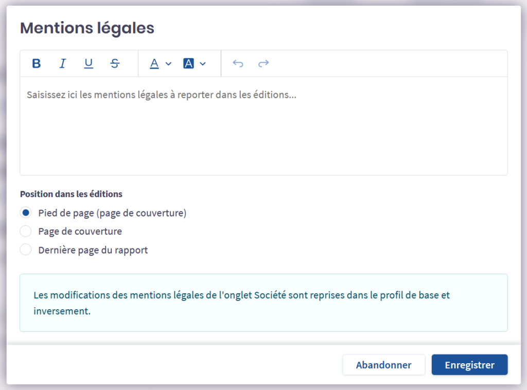 Dans l’écran qui apparaît, saisissez alors vos mentions légales avec la mise en forme de votre choix. Modifiez le texte à votre convenance et définissez l’emplacement où les mentions légales s’afficheront dans vos éditions.