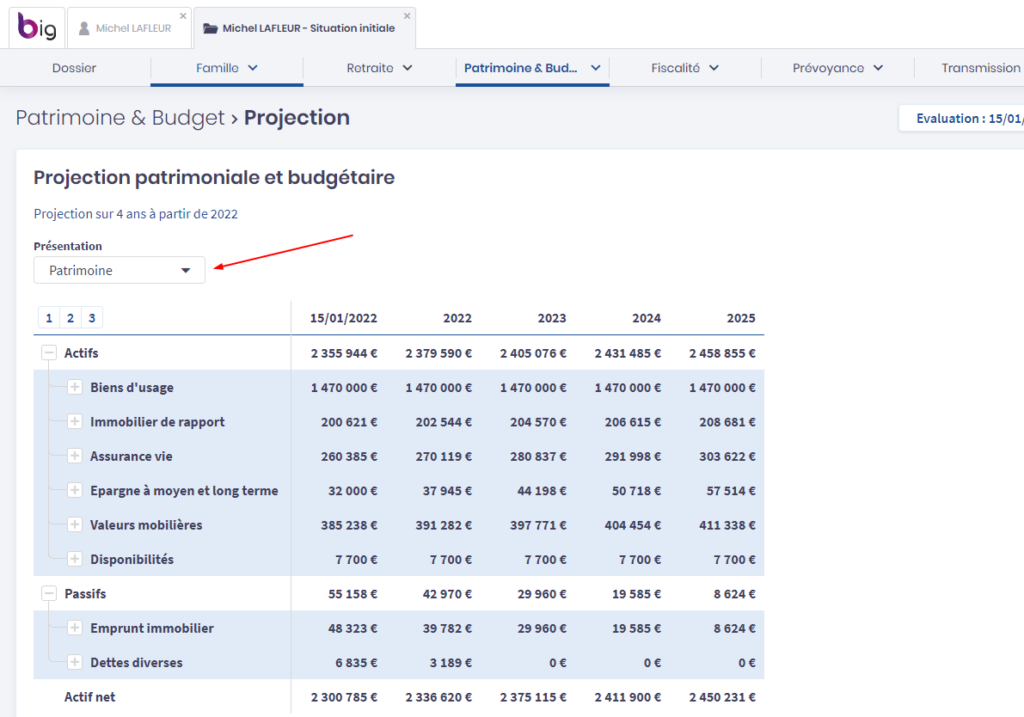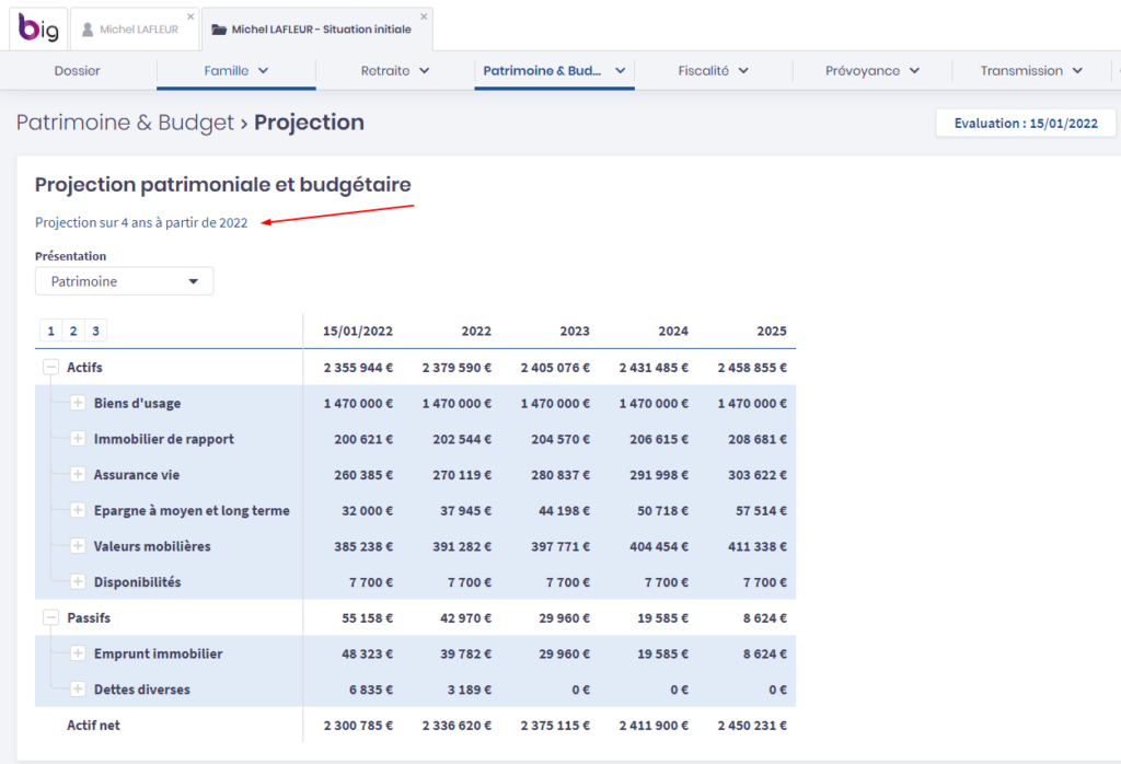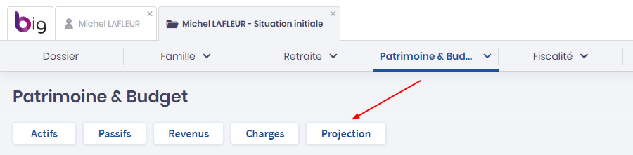 Vous pouvez désormais étudier l’évolution patrimoniale et budgétaire de votre client en cliquant sur le bouton Projection dans l’écran Synthèse de « Patrimoine & budget ».