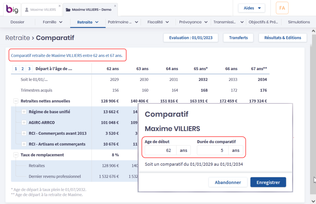 Depuis la partie Retraite > Comparatif, consultez l’impact de l’âge de départ en retraite sur le montant des futures pensions et rentes de vos clients.