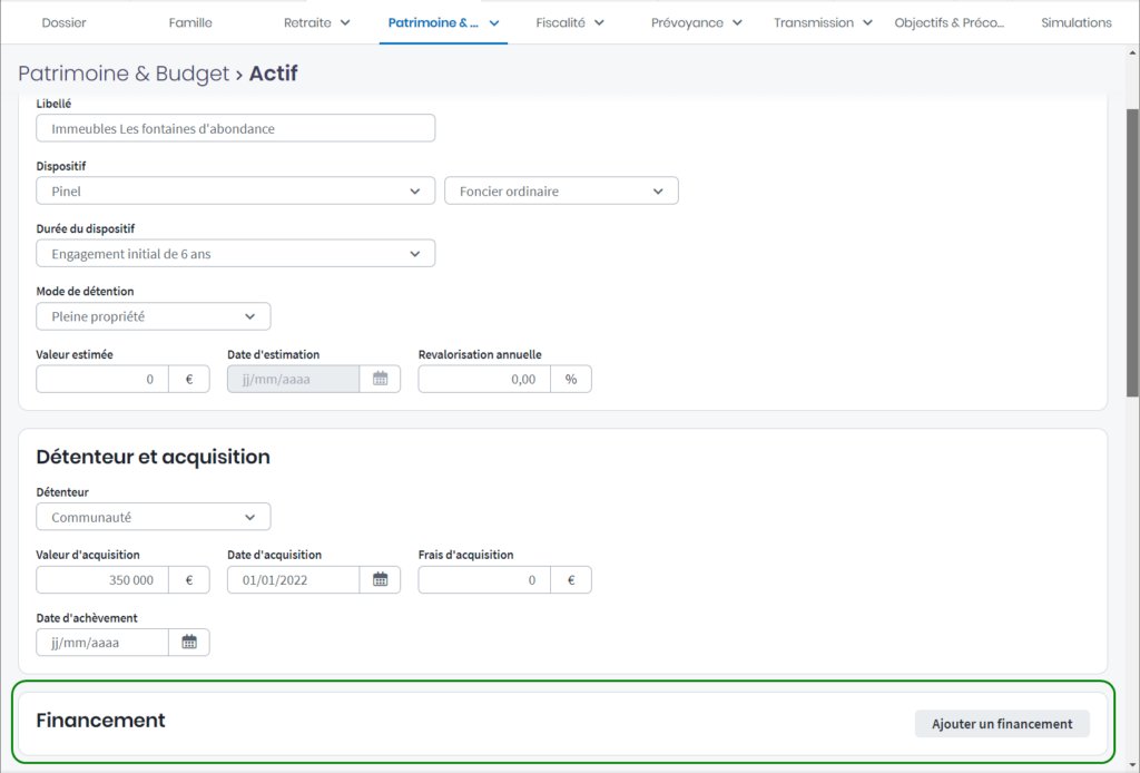 Pour mieux repérer la saisie d’un crédit lié à un actif, nous avons créé un bloc dédié nommé Financement dans la saisie des actifs.