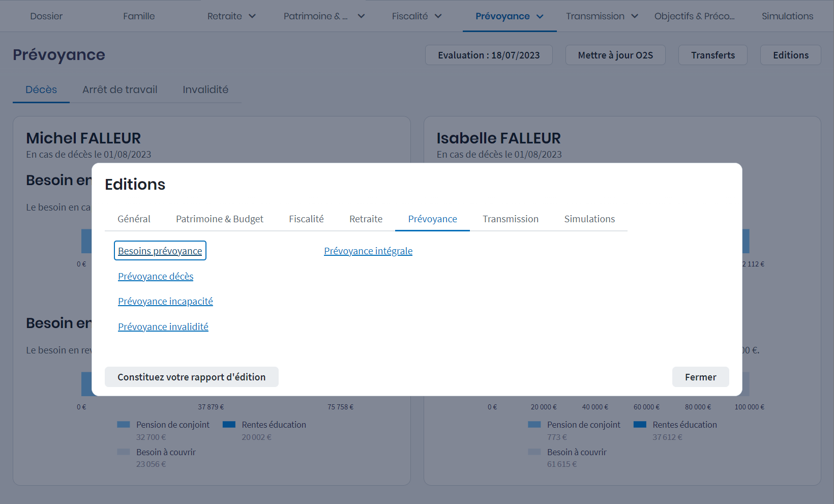 Par ailleurs, dans la section Constituez votre rapport d’édition, vous pourrez sélectionner les sections du rapport « Prévoyance intégrale » qui vous semblent pertinentes, afin de les éditer dans un rapport personnalisé contenant uniquement les sections sélectionnées.