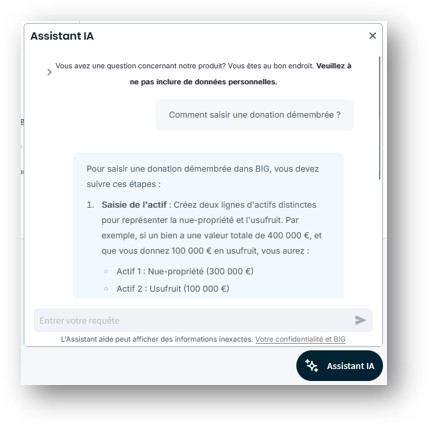 Un simple clic suffit pour ouvrir une boîte de dialogue et poser vos questions ou rédiger un prompt : l’Assistant IA Big vous répond instantanément.