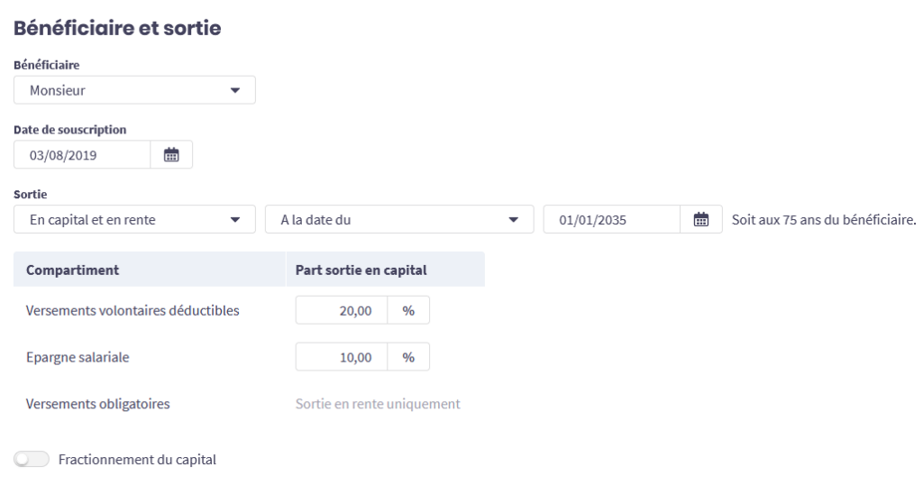 Présente en cas de sortie « En capital » ou « En capital et en rente », l’option Fractionnement du capital permet de d’étaler la perception du capital sur plusieurs années.