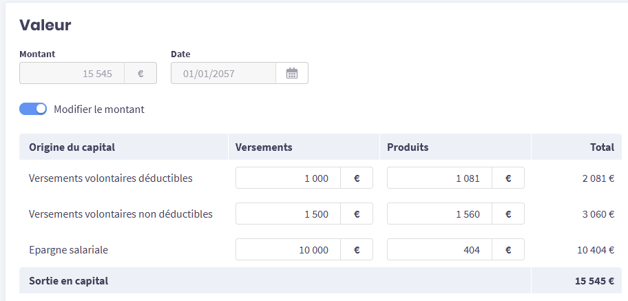 Par défaut, le montant de la sortie en capital est calculé automatiquement.