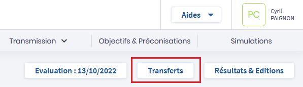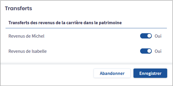 Pour savoir si les revenus renseignés dans la carrière du client sont automatiquement transférés dans la section Revenus du Patrimoine, cliquez sur le bouton Transferts dans la partie supérieure du dossier client.