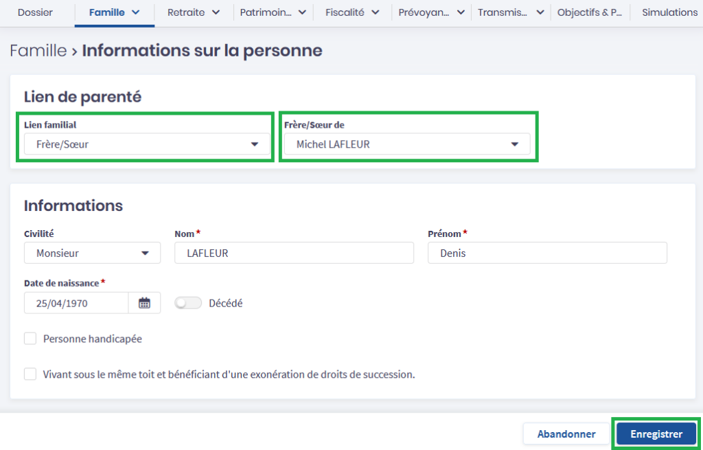 Renseignez la civilité, le nom, prénom et date de naissance du frère de Michel Lafleur, puis cliquez sur Enregistrer.
