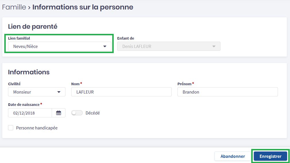 Renseignez la civilité, le nom, prénom et date de naissance du neveu, puis cliquez sur Enregistrer.