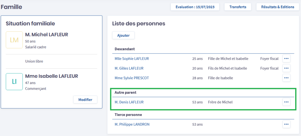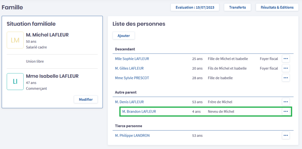 Considérons que vous souhaitez renseigner Brandon Lafleur, le neveu de Michel Lafleur (votre client), dans l’onglet Famille de ce dernier. Brandon est le fils de Denis Lafleur, frère de Michel Lafleur.
