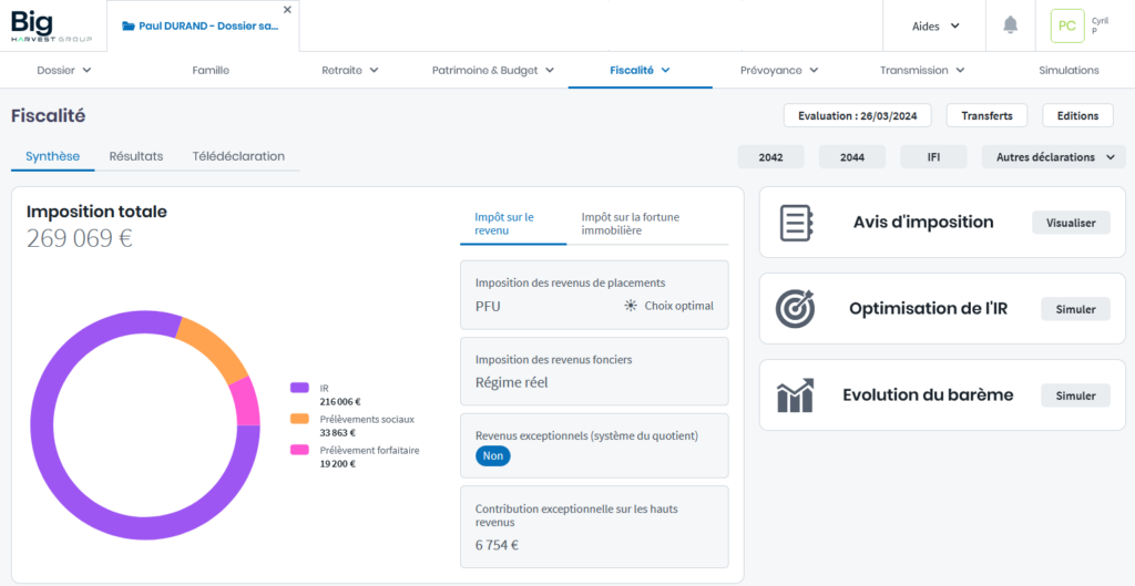 - La gestion de la fiscalité du client via des dossiers fiscaux, soit en récupérant automatiquement les informations du patrimoine, soit de façon autonome en saisissant les informations dans les déclarations ;