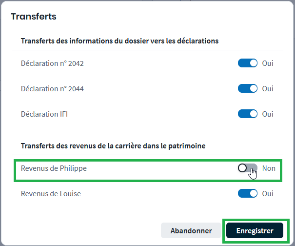 Dans la section Transferts des revenus de la carrière dans le patrimoine,