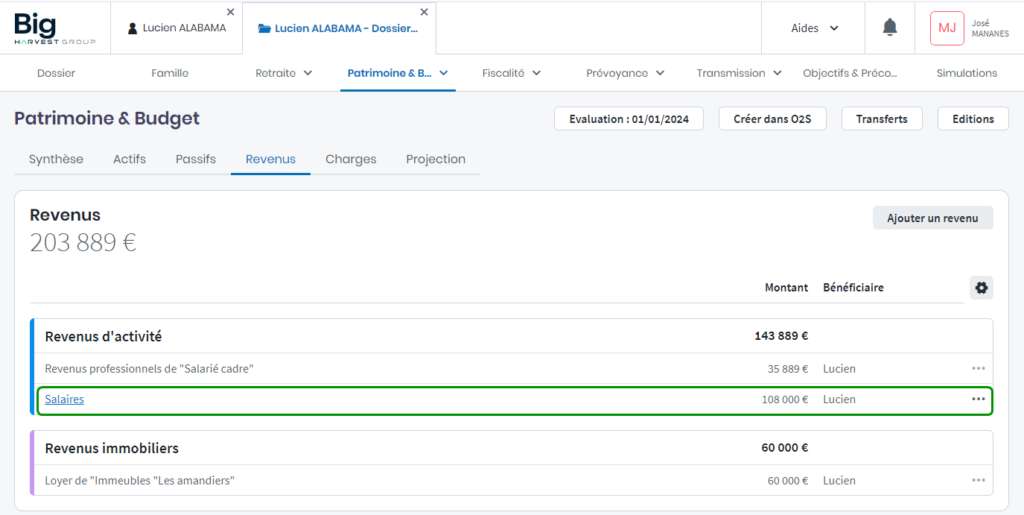 Les revenus affichés dans l’onglet Patrimoine & Budget ont deux origines distinctes :