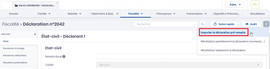 - Une fois que le fichier vous a été transmis par votre client, rendez-vous dans Big dans la déclaration 2042 puis cliquez sur le menu d’option et sélectionnez « Importer la déclaration pré-remplie » :