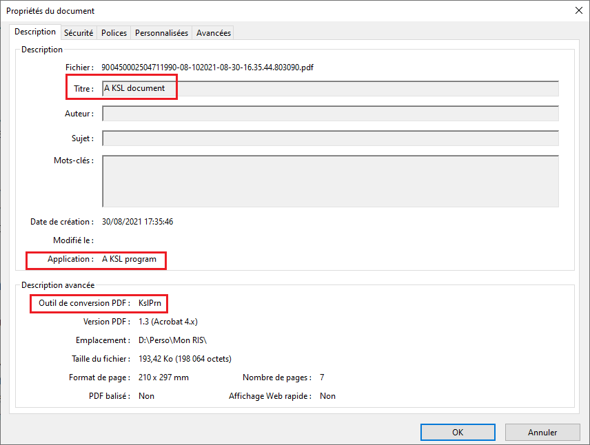 - la ligne Outil de conversion PDF doit indiquer : « KslPrn »