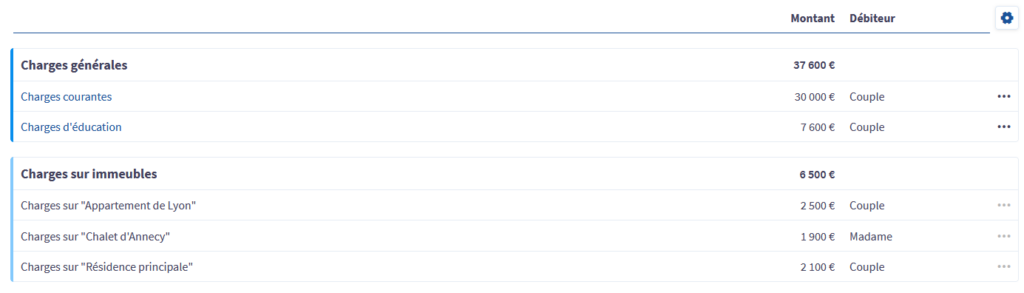 Les éléments dont le bouton est grisé correspondent à des dettes liées à un actif.
