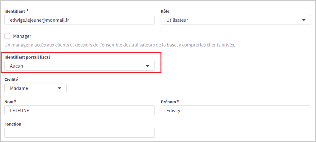 2. Dans la fenêtre Compte utilisateur, gérez l’association à l’aide de la liste déroulante Identifiant portail fiscal :