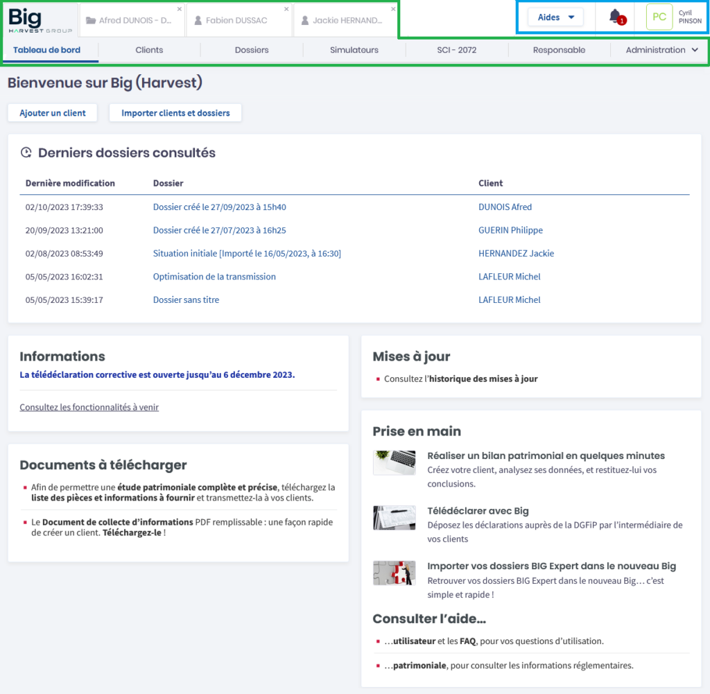 - Tableau de bord : il donne accès à la liste des derniers dossiers ouverts, à des informations règlementaires, aux fonctionnalités à venir, à l’historique des mises à jour, à des documents à télécharger ainsi qu’à des aides et tutos destinés à vous accompagner dans votre découverte de Big.