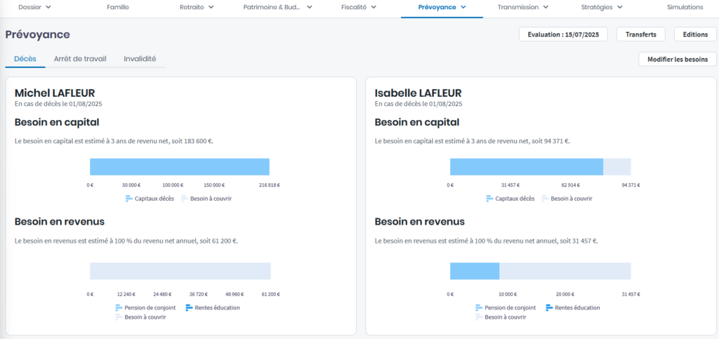Les besoins en capital et en revenus sont calculés sur la base des revenus issus de la carrière. En l’absence de revenus saisis dans la carrière, le besoin en garanties ne peut donc pas être déterminé. Les besoins en capital et en revenus peuvent être modifiés en cliquant sur Modifier les besoins.