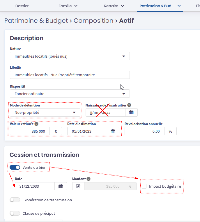 Vous devez décocher Impact budgétaire de la cession pour ne pas fausser les projections budgétaire du client. L’objectif est de matérialiser la sortie du bien du patrimoine en nue-propriété au profit de la pleine propriété.