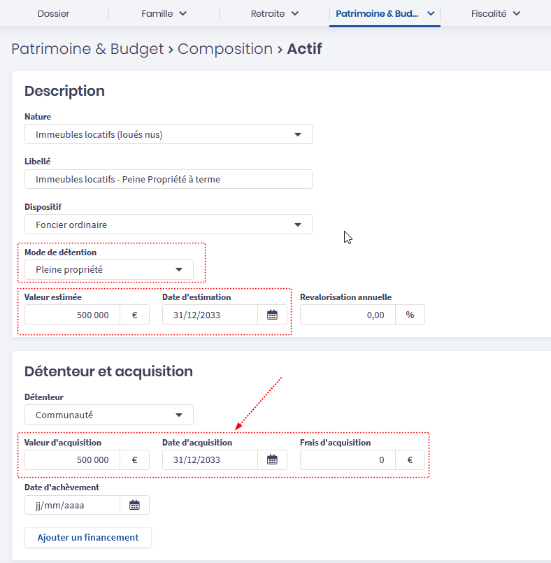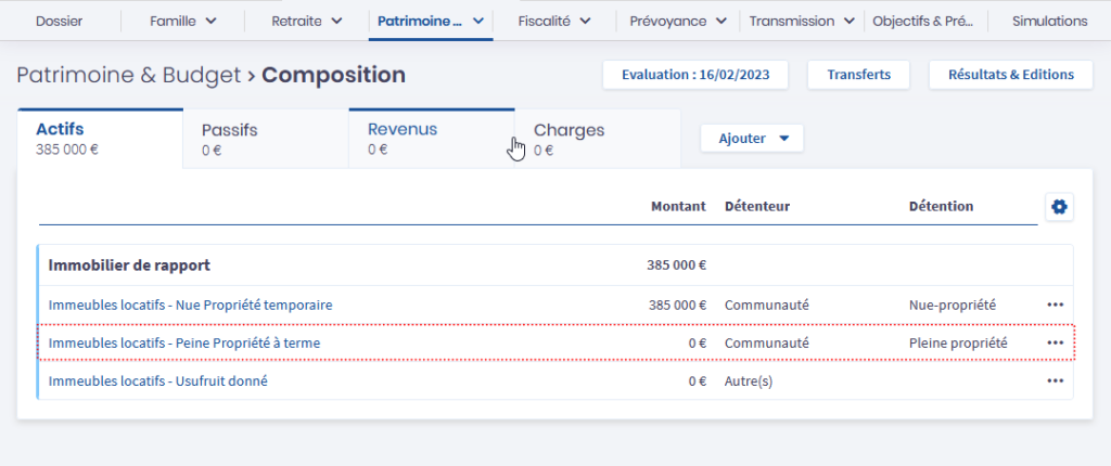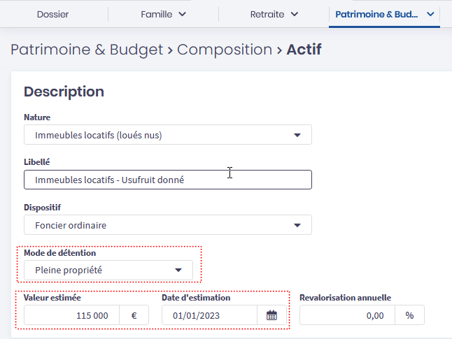 Dans Actif, ajoutez un second bien qui illustre l’usufruit temporaire. Vous devez indiquer en valeur estimée uniquement la valeur de l’usufruit mais le saisir en pleine propriété.