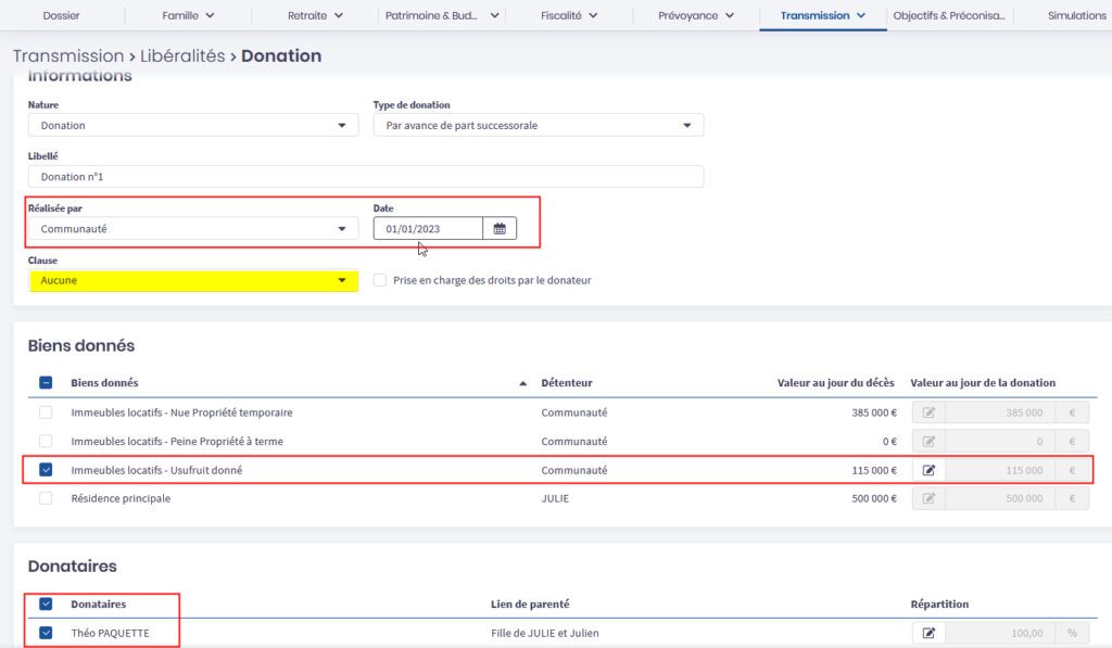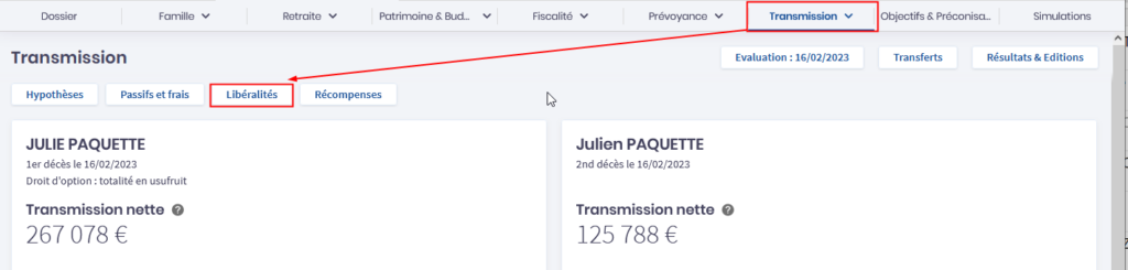 Dans l’onglet Transmission, les donations sont identifiées via le bouton Libéralités en cliquant sur Ajouter de la section Donation.